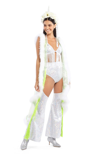 Green Iridescent Hooded Vest with White Feather Lining