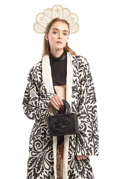 Pink beaded bag with green beaded Supergirls logo and green marijuana plant