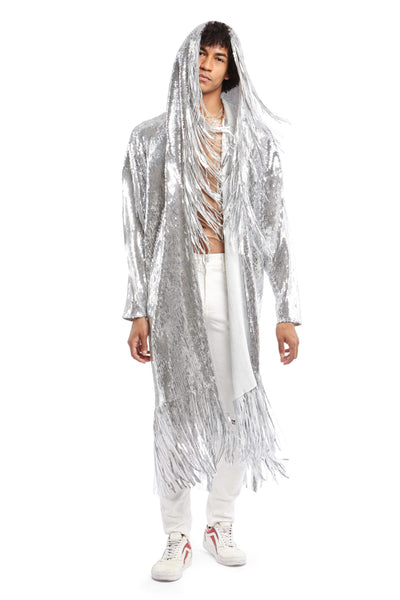 Men's Silver Hooded Sequin Robe with Fringes