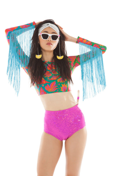 Graphic turquoise, red, fuchsia floral print high waisted hot pants