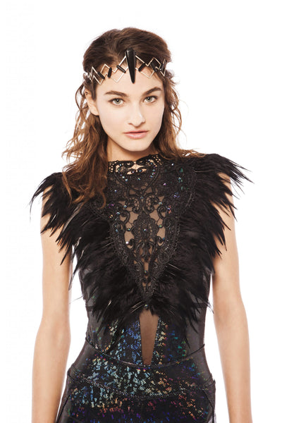 Are you a statement maker? If so, we have just the item for you: this striking blac feather and shell collar with pearl beading and gold harware. Wear it around your neck and you will need little else to finish your look. The crochet embroidery behind the shell lining makes it very comfortable to wear.