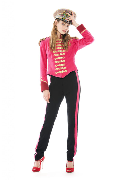 This black and red velvet cape is a modern and chic twist on military styles from the past and is a must-have for your next festival experience. The jackets and capes are bespoke designs made in Pinky Laing's atelier in London and are timeless pieces that will make everyone around you want one.
