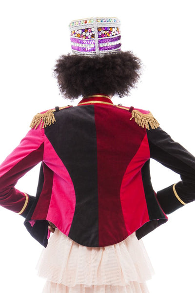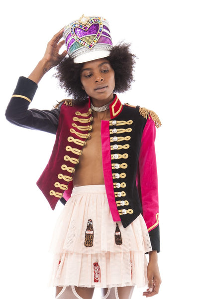 This hunter green velvet jacket with red velvet collar and cuffs and silver taping at the front is a modern and chic twist on military styles from the past - it is must-have for your next festival! The jackets are bespoke designs made in Pinky Laing's atelier in London and are timeless pieces that will make everyone around you want one.