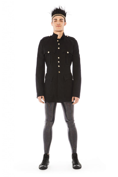 Look like a starry night in this beautiful silver star embellished and black hat. The military style of the hat will make any look cool and the black combined with silver mirror stars and studs and hardware give it an extra edge. Wear it with a black and silver embroidered robe for an amazing effect.