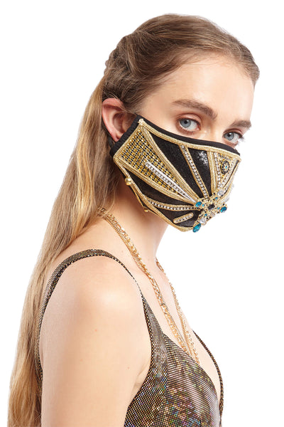 The Royal Raver Black and Gold Rhinestone Mask with Embellished Cross